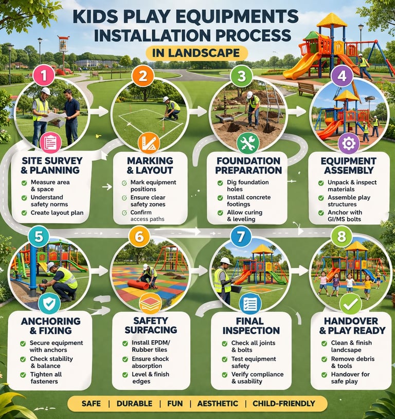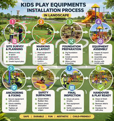 We design and develop modern kids play areas that combine safety, creativity, and durability. From schools to gated communities, we create engaging environments where children can play, grow, and stay active.